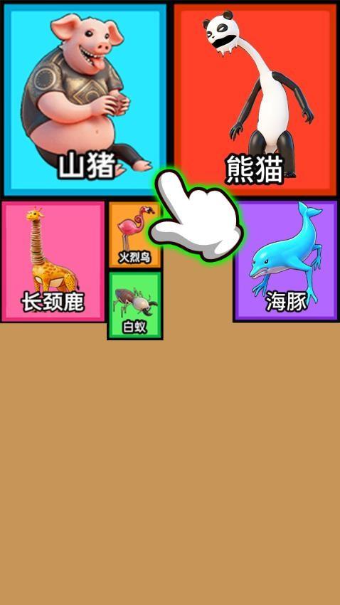 提供孔雀、长颈鹿、火烈鸟、狐狸、大象、白鲸、蝙蝠等类型的动物合成玩法,小动物合成大动物。