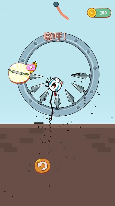 2.只需把火柴人往下方拖拽,使其坠落到尖刺上就行。像下图展示的那样,顺利通关就能得到金币奖励。