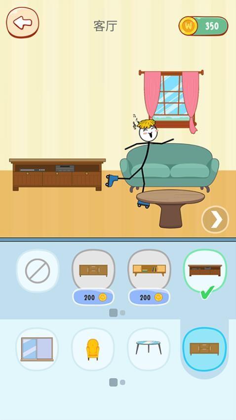 玩家在通过了相应关卡之后,可解锁更多金币,可以利用金币来购买相应的家具,火柴人可获得舒适客厅。