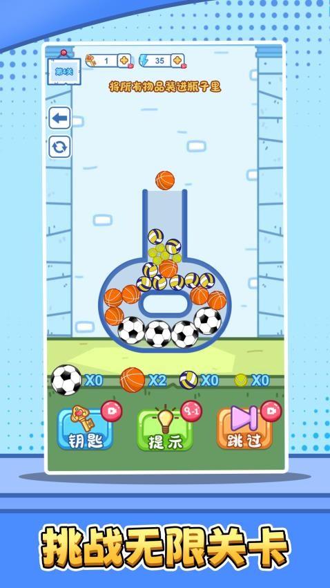 1、破局闯奇关手游画面显示不同的物品类型,你需要将足球、篮球全部装入到瓶子里面。