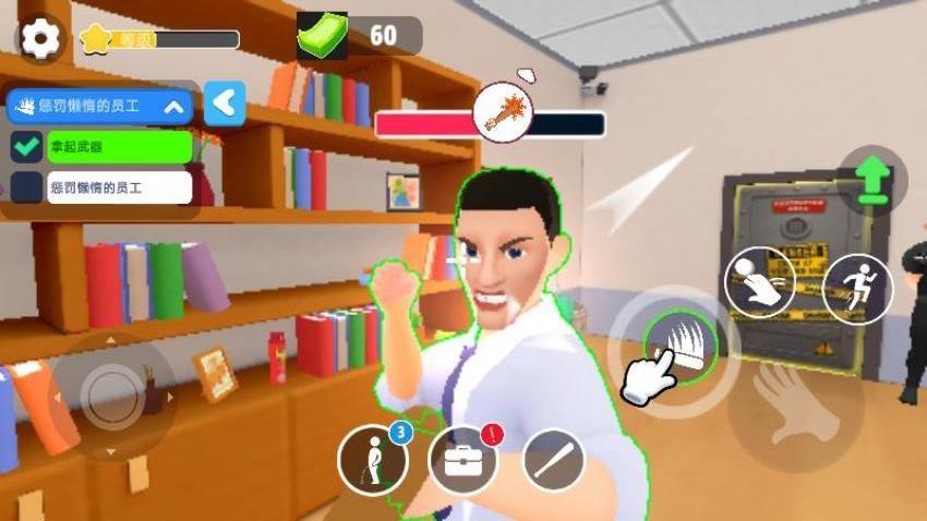 1、玩家在这里需要拿起适合的武器来攻击坐在办公位上的员工,立即完成相应的惩罚任务。