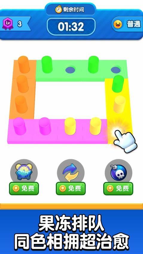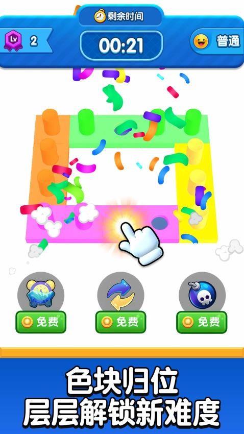 这是一款休闲益智类的色块归位游戏,核心玩法是在限定时间内,将不同颜色的果冻状色块拖动到对应颜色的凹槽中,让色块与底色完全匹配。随着关卡提升,色块的布局会更复杂,还会出现多层嵌套、多色混合等挑战,同时可以使用辅助道具来完成高难度关卡,整体画风明快治愈,操作丝滑,非常考验你的观察力与手速。