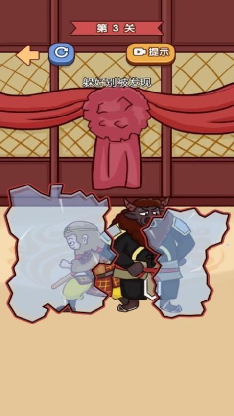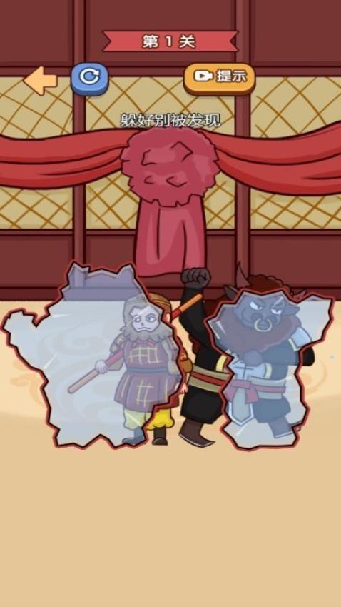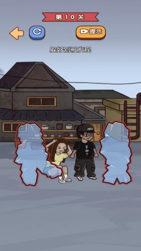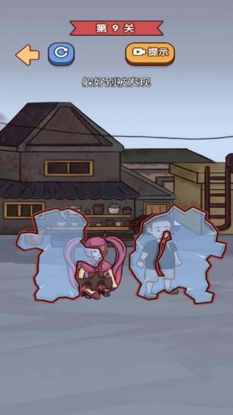 关卡提供两个角色需要躲避,显示两个空白的躲藏区域,将角色拖动到空白区域就可以躲藏。