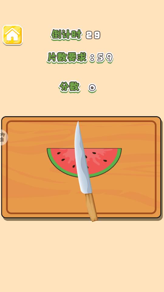 5、切西瓜界面,提示30秒的时间,你需要切割59片,一直点击屏幕就可以开始切西瓜,玩法非常简单。