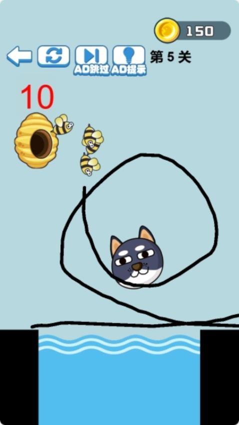 2、画面显示一个蜜蜂,显示一个狗头角色,您需要画线将狗狗保护起来,如果被攻击就挑战失败。