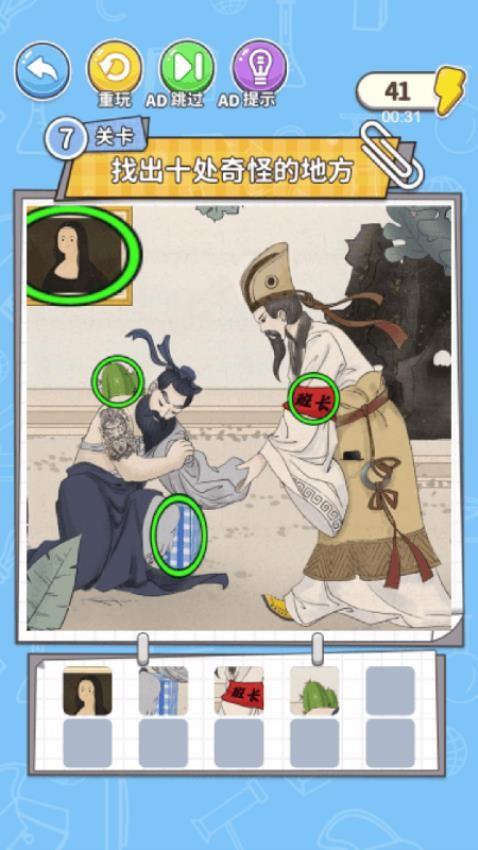 画面显示怪异的地方,你需要认真查看游戏内容,找到不合理的地方,体验找茬的玩法。