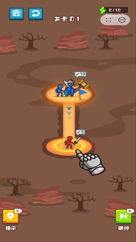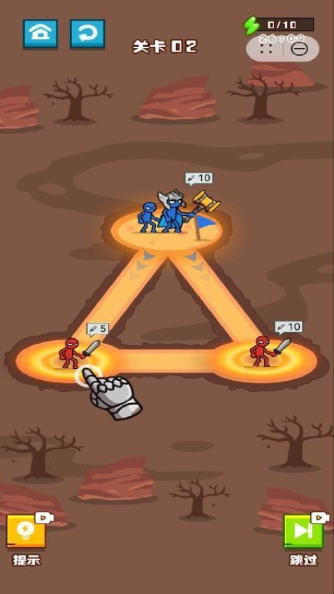 3、第二关里面出现了一个三角形的对战布局,先朝着只有5点战力的敌人前进,完成挑战后继续往右前进。