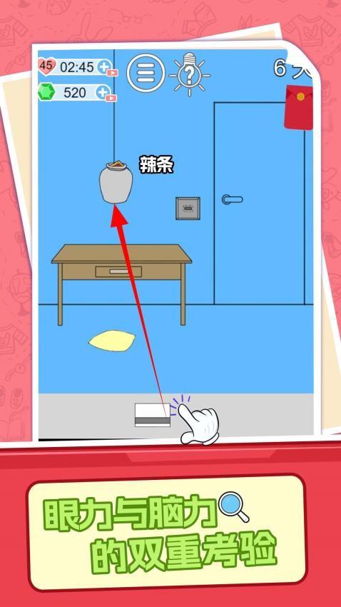 5、找到可以通过关卡的道具,脑力大赛速战速决手游提供的关卡都需要找到最终的一个红色物品才能通过关卡。