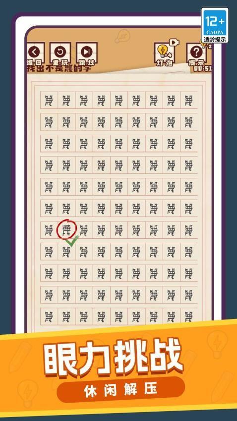 2、在游戏体验不同的汉字玩法,直接找到错误的汉字,找到不同的汉字。