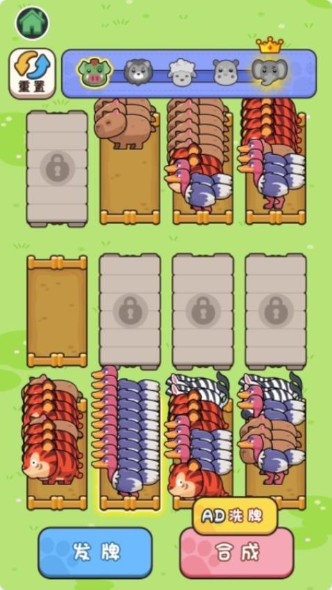 在游戏界面显示很多动物牌,点击发牌就可以自动显示新的动物,拖动相同的动物到一个区域就可以合成。