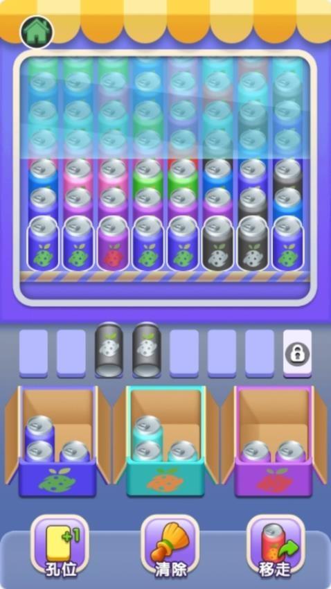 3、易拉罐消除的界面,顶部区域显示不同颜色的易拉罐,你需要将其按照颜色放入底部的盒子。