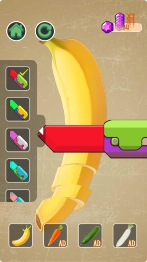 4、萝卜刀游戏界面,在游戏切换不同的萝卜刀开始切割香蕉,点击屏幕就可以开始切。