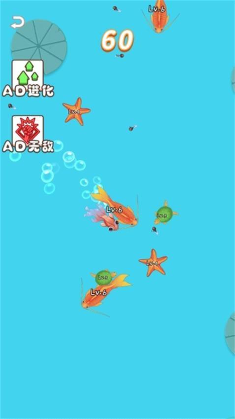游戏显示海底场景,你可以在游戏遇到很多鱼类,吞噬三个相同的物种就可以进化为下一个物种。