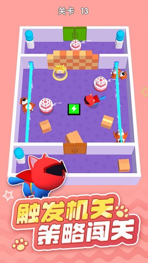 1.在关卡里,你要操控猫咪角色,借助场景中的机关,规划好移动路线,避开敌人,触发机关来开启通道,从而完成关卡挑战。