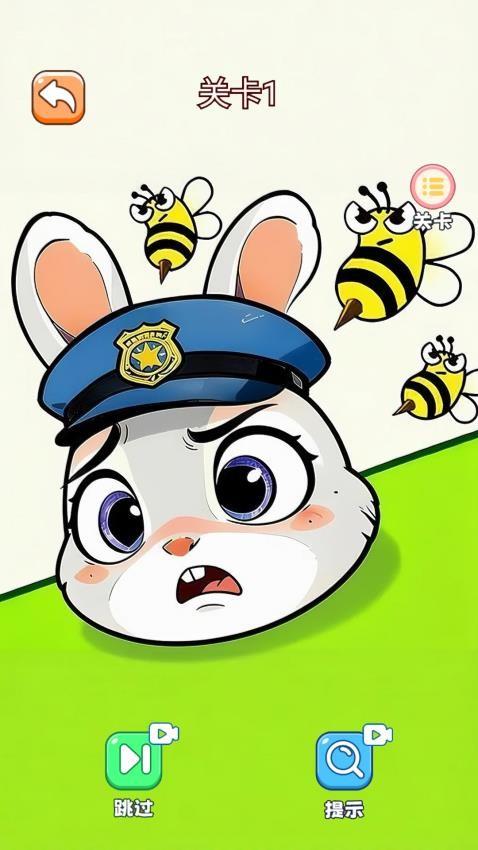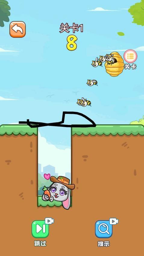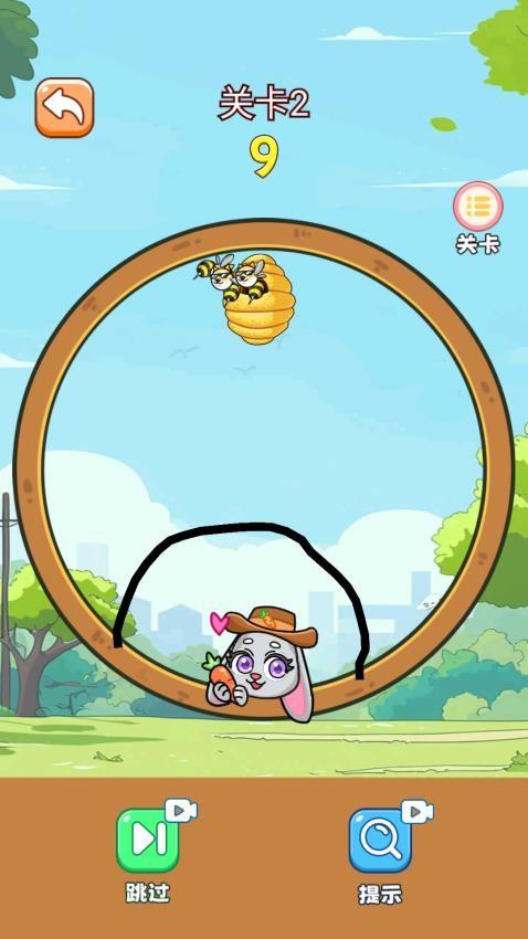 3、在关卡2的场景中,你将见到与蜜蜂同在一个圈里面的兔子,需找到最佳的画线方法。