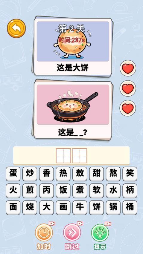 在关卡中你需关注红心的数量,玩家只能在消耗完这些红心之前获得正确词语,才能获得成功。