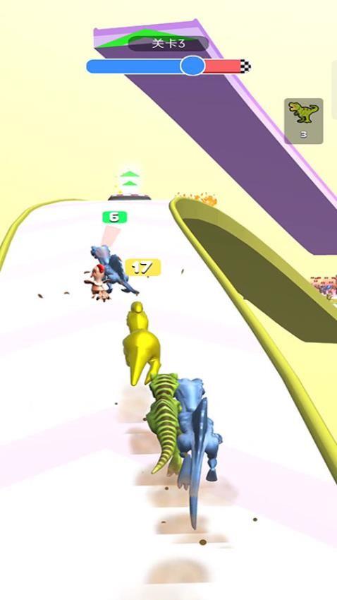 这是一款跑酷游戏,玩家指尖移动恐龙,躲避跑道上的障碍,获取道具与小帮手,顺利到达战斗场,合成恐龙进行升级,获取更高战斗力,开启对战,赢得胜利!
