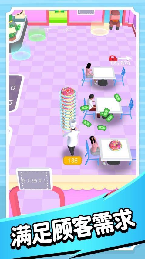 开心甜甜圈2是一款超级好玩的休闲游戏。立志成为一名卓越厨师,精心烹饪,将一份份美味佳肴送至更多人手中。认真收集、巧妙堆叠面团,为每一位顾客用心准备食物。你能制作披萨、甜甜圈、热狗等多样美食,不断充实技能宝库。努力成为顶尖大厨,高效服务众多顾客。持续升级食物,收获更多财富!尽情体验游戏快乐,释放压力。