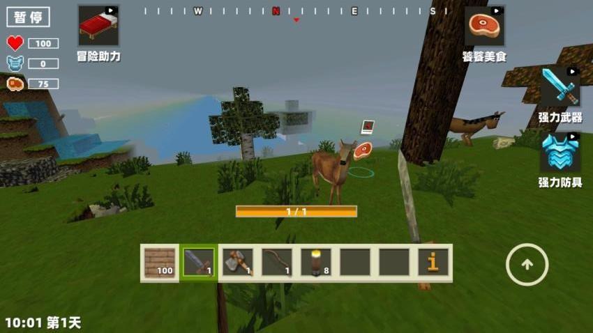 2、简单的伐木、挖矿和捕猎获取资源,利用武器工具进行操作就能收集各式各样的物资,可以迅速推进发展。