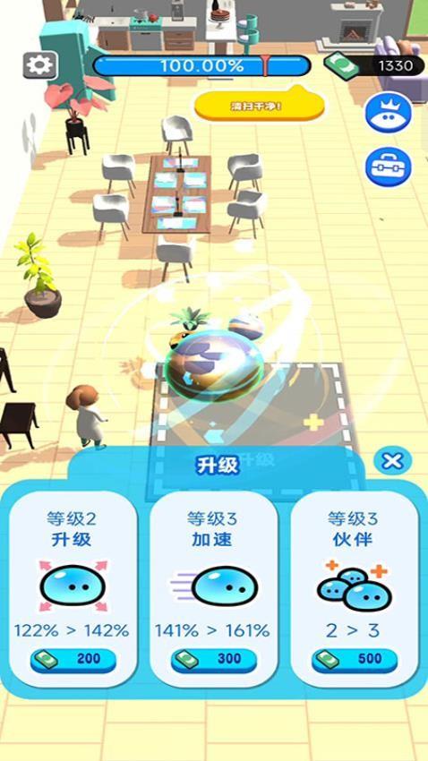 史莱姆是可以升级的,随着获取的钞票不断变多,玩家可以使用钞票升级史莱姆,提升打扫速度。