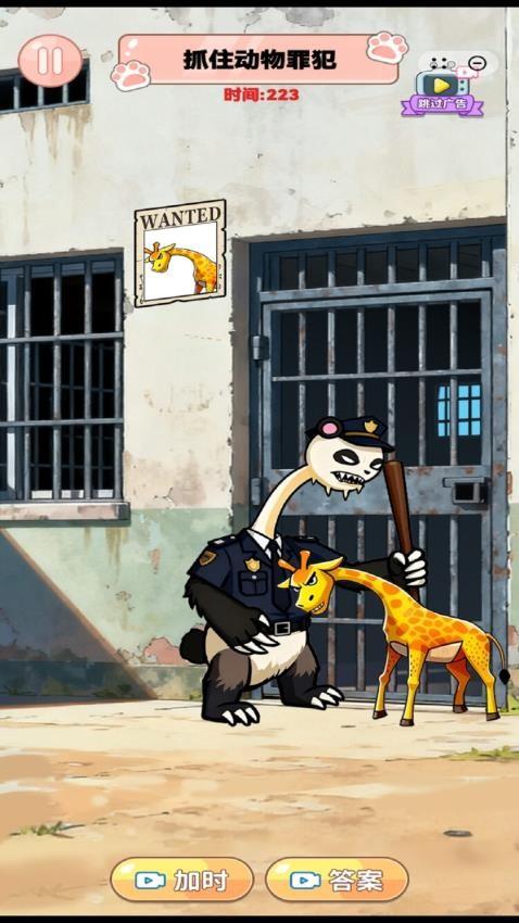 《最强脑力大挑战》是一款充满趣味的动物抓捕益智游戏,你将扮演动物警察,在监狱场景中根据“通缉令”线索,快速辨别长颈鹿、孔雀、白鲸等动物是否为罪犯。通过点击“通过”或“抓捕”按钮做出判断,在限时挑战中锻炼观察力,开启一场紧张又有趣的动物罪犯抓捕之旅。
