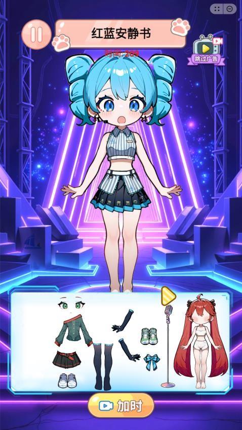 这是《校园贴纸画》装扮游戏,以赛博霓虹舞台为背景,主打潮流角色装扮:你可以为Q版角色搭配五官、发型,选择校园风、舞台风等服饰与装饰,还需在倒计时内完成造型,同时支持切换不同角色形象,轻松打造出亮眼的舞台风格装扮。