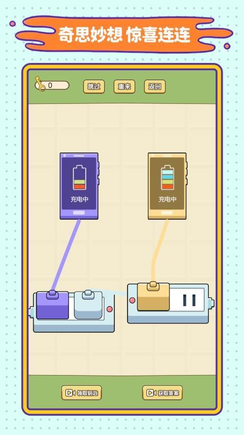 连线我巧棒游戏是一款好玩有趣的休闲益智闯关手游。给相关的插头找到适合的插座即可为手机充上电,玩家在挑战期间需要仔细观察画面中所出现的插板情况,一些插板将会被掩盖或是直接不在界面上出现,需使用特殊的方式找到它们,这样才能连接插头。连线的过程中你还要注意各个插头的大小和位置,挑选最佳的连接方式,这样就不会受到这些因素的影响,将插头移动到正确的插孔上。当你发现了一些挑战规律之后,能够在闯关过程中得到相应的好处,并且还能收获各种优势机会。如果你也对连线我巧棒手机版感兴趣的话,快来试玩吧!