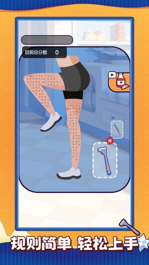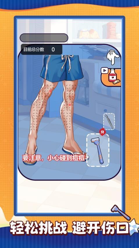 1、进入游戏后,你要按照手指的指示拖动工具去给小姐姐刮掉腿毛。