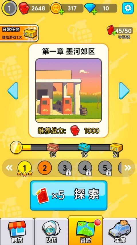 1、进入游戏里面你将看到墨河郊区这个冒险主题,安排适合的人员便可开始应对这个地方的僵尸。