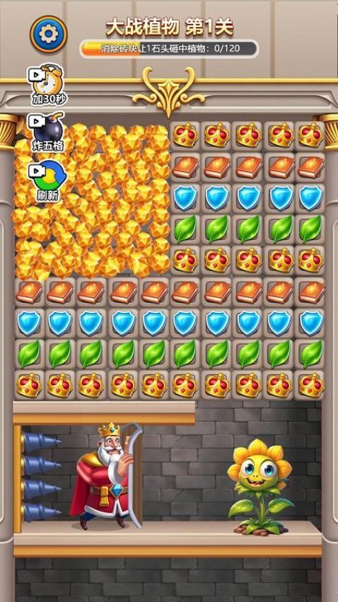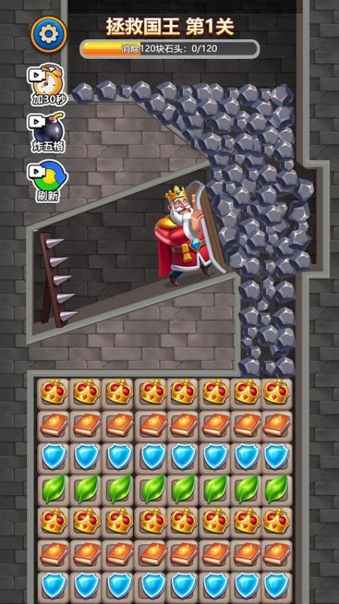 1、置身于危机四伏的王国世界,查看关卡场景信息移动方块进行消除,尽快清除所有石块障碍救出国王完成挑战。