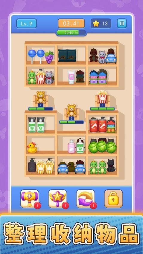 玩家需在货架上找到相同的物品,便可确定最佳的整理方式,获得消除结果。