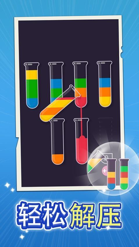 将水倒在管子之间,直到每个管子只含有一种颜色!你只能把同样颜色的水倒在已经装在管子里的水上。